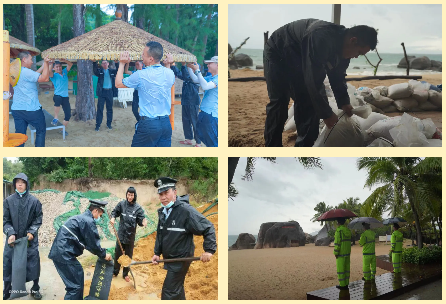 天涯海角游览区已完成树枝封顶、回收帐篷遮阳伞、用防汛沙袋加固门窗、设置海上警戒线等工作。以安全保卫部115人为景区主要抢险力量,配备雨衣、雨靴、强光电筒、尼龙绳、防汛沙袋等一批防汛防风物资。其余人员已全部完成撤离,海上运营船只已全部入港停靠。