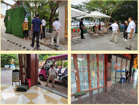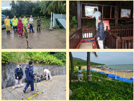 由副总经理林有炜带队,景区组织保安部、监察审计部、商业服务办、工程部、园容部联合召开了防台防汛检查工作,排查相关隐患3项并立即完成整改;组建25人的应急队,并装配有沙袋、雨衣、雨鞋、手电筒、铁铲、水桶、手套、水泵、排水管、铁丝、应急车、通讯工具等物资设备。
